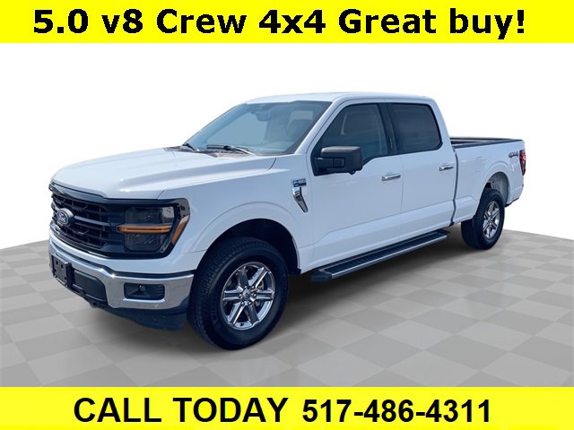 CARFAX One-Owner. Bluetooth, Backup camera, 4WD, Equipment Group 301A Standard, Navigation system: Connected Navigation, 3.31 Axle Ratio, 4-Wheel Disc Brakes, 6 Speakers, ABS brakes, Air Conditioning, Alloy wheels, AM/FM radio: SiriusXM with 360L, Auto High-beam Headlights, Auto-dimming Rear-View mirror, Automatic temperature control, Brake assist, Bumpers: chrome, Chrome wheels, Cloth 40/20/40 Front Seat, Compass, Delay-off headlights, Driver door bin, Driver vanity mirror, Dual front impact airbags, Dual front side impact airbags, Electronic Stability Control, Emergency communication system: SYNC 4 911 Assist, Front anti-roll bar, Front Center Armrest w/Storage, Front dual zone A/C, Front fog lights, Front reading lights, Front wheel independent suspension, Fully automatic headlights, Heated door mirrors, Illuminated entry, Low tire pressure warning, Occupant sensing airbag, Outside temperature display, Overhead airbag, Overhead console, Panic alarm, Passenger door bin, Passenger vanity mirror, Power door mirrors, Power driver seat, Power steering, Power windows, Radio data system, Radio: AM/FM SiriusXM w/360L, Rear reading lights, Rear step bumper, Rear window defroster, Remote keyless entry, Security system, Speed control, Split folding rear seat, Steering wheel mounted audio controls, SYNC 4 w/Enhanced Voice Recognition, Tachometer, Telescoping steering wheel, Tilt steering wheel, Traction control, Trip computer, Variably intermittent wipers, Voltmeter, Wheels: 18 Chrome-Like PVD, 4WD, Equipment Group 301A Standard, Navigation system: Connected Navigation. Oxford White 2024 Ford F-150 XLT 4WD 10-Speed Automatic 5.0L V8